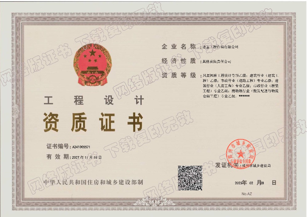 風景園林工程設計專項乙級;市政行業《排水工程)專業乙級;建筑行業 (建筑工程)乙級;市政行業(道路工程)專業乙級;建筑行業(人防工程)專業乙級;市政行業(橋梁工程)專業乙級;農林行業(農業工程(農業綜合開發生態工程))專業乙級;商物糧行業(批發配送與物流倉儲工程)專業乙級。